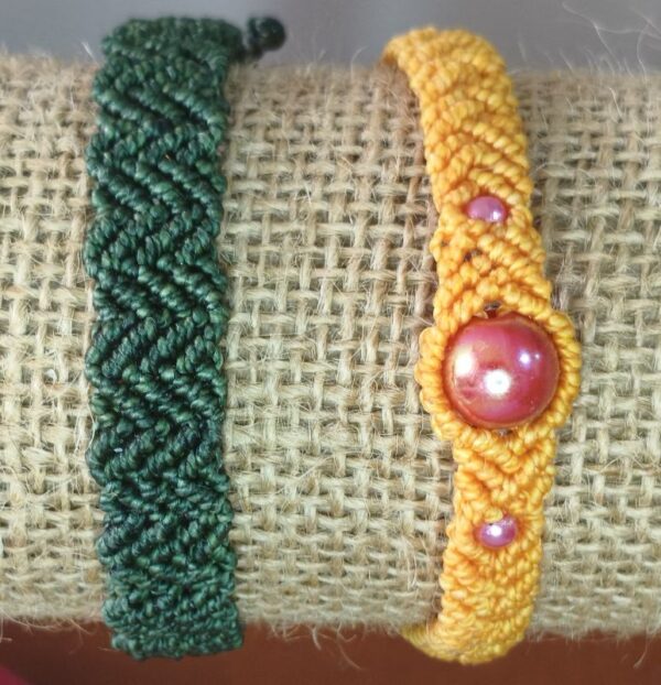 Dos pulseras de hilo encerado colores verde y amarillo. Pulsera verde: ancho cms, muñeca cms; pulsera amarilla: ancho cms, muñeca cms.
